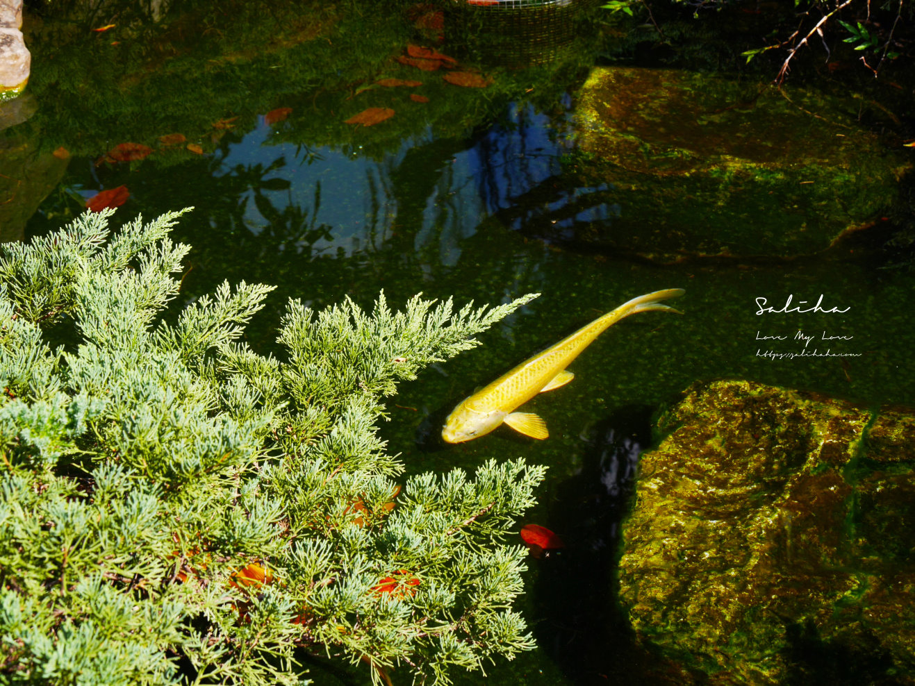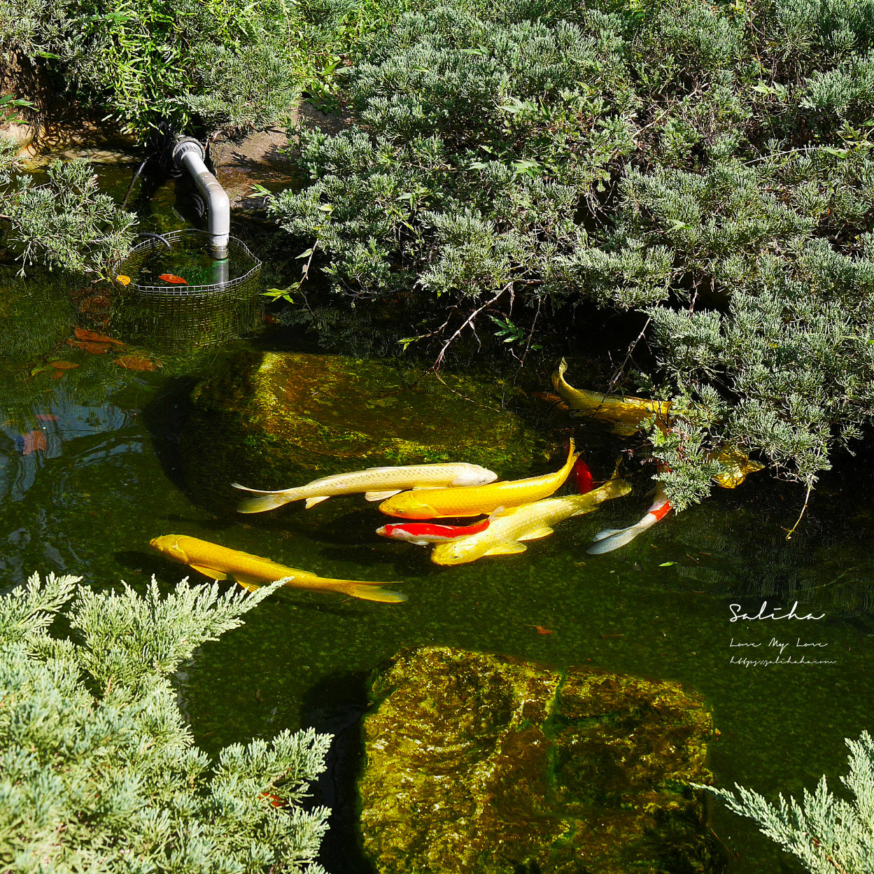 除了古樸的室內環境,戶外也有優美的庭院,最吸睛的就是被植物環繞的鯉魚池了,飯後我們帶小皮寶來這看看魚,這裡的鯉魚好美,尤其是金色的鯉魚,金燦燦的悠遊水間,與今日的陽光相映成趣