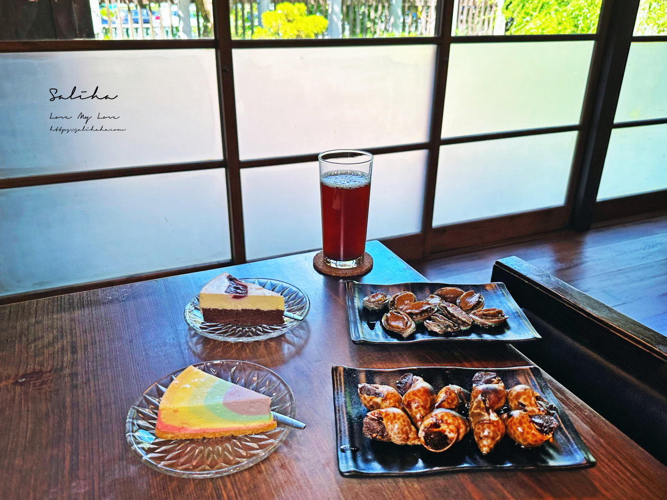 有百年歷史的日式宿舍改建、靜謐優美的《靜心苑》,在帶著濃濃日式氛圍的老屋裡用餐格外有情調!除了中式定食,也有飲品及點心、小食等,來份美美的彩色起司蛋糕,再來份甜辣夠味的烤鳳螺,雖然兩者好像不搭嘎,但其實也挺有意思!戶外庭園還有鯉魚正悠游著呢