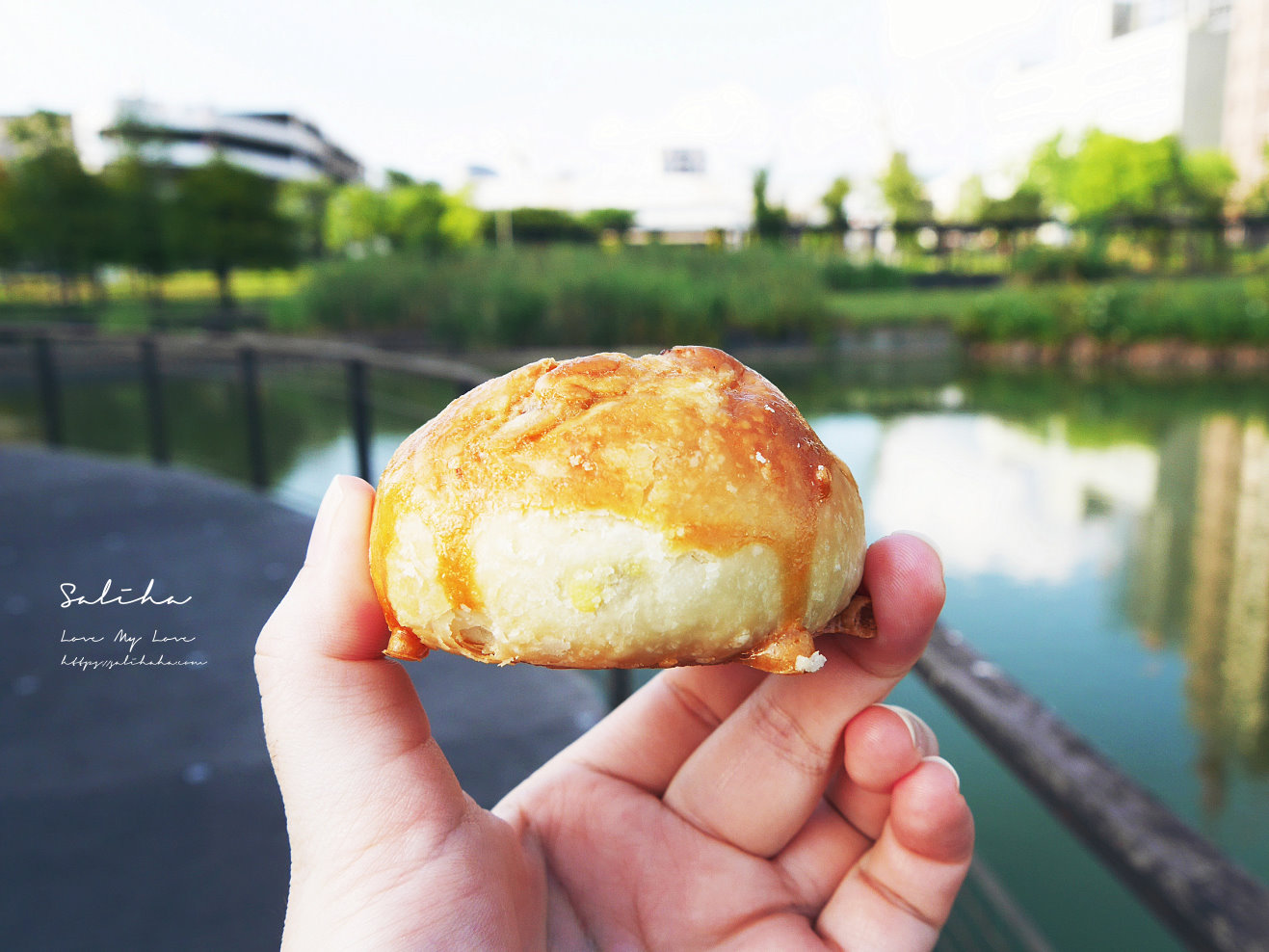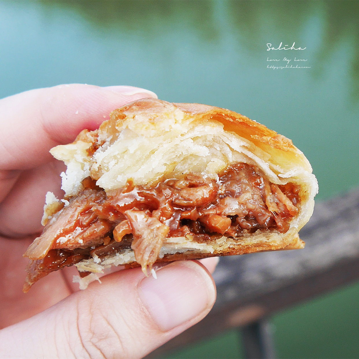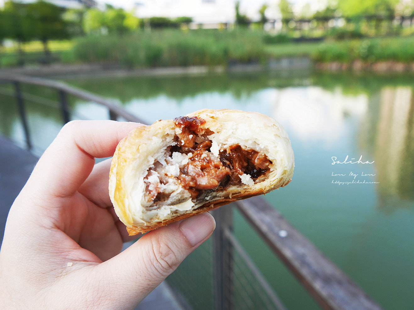 可以把燒包想成是另一種版本的叉燒酥,咬下去皮很酥香,內餡是甜大於鹹、香滑不柴的叉燒風豬肉餡,香氣瀰漫、份量紮實的肉餡配上香酥微脆又有濃香的外皮相當可口,好吃又有口感,而且冷掉吃也很讚耶,不影響美味,非常適合帶幾顆去野餐,今天買來當散步小點真是對了,恰好剛剛也買了一杯金萱茶,看看美景、吃點茶點,多麼愜意舒暢啊!
