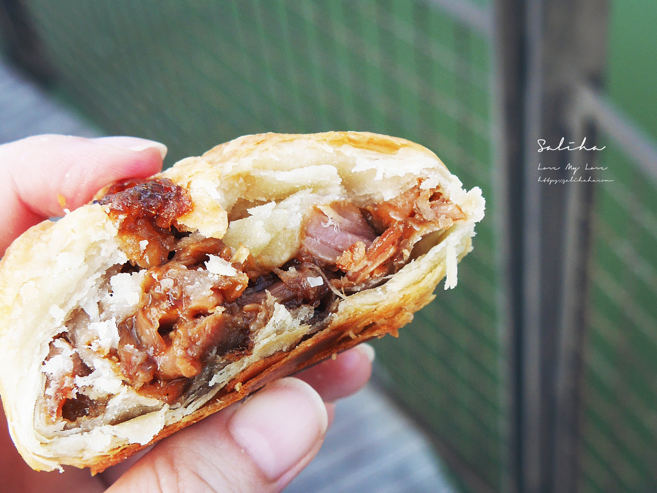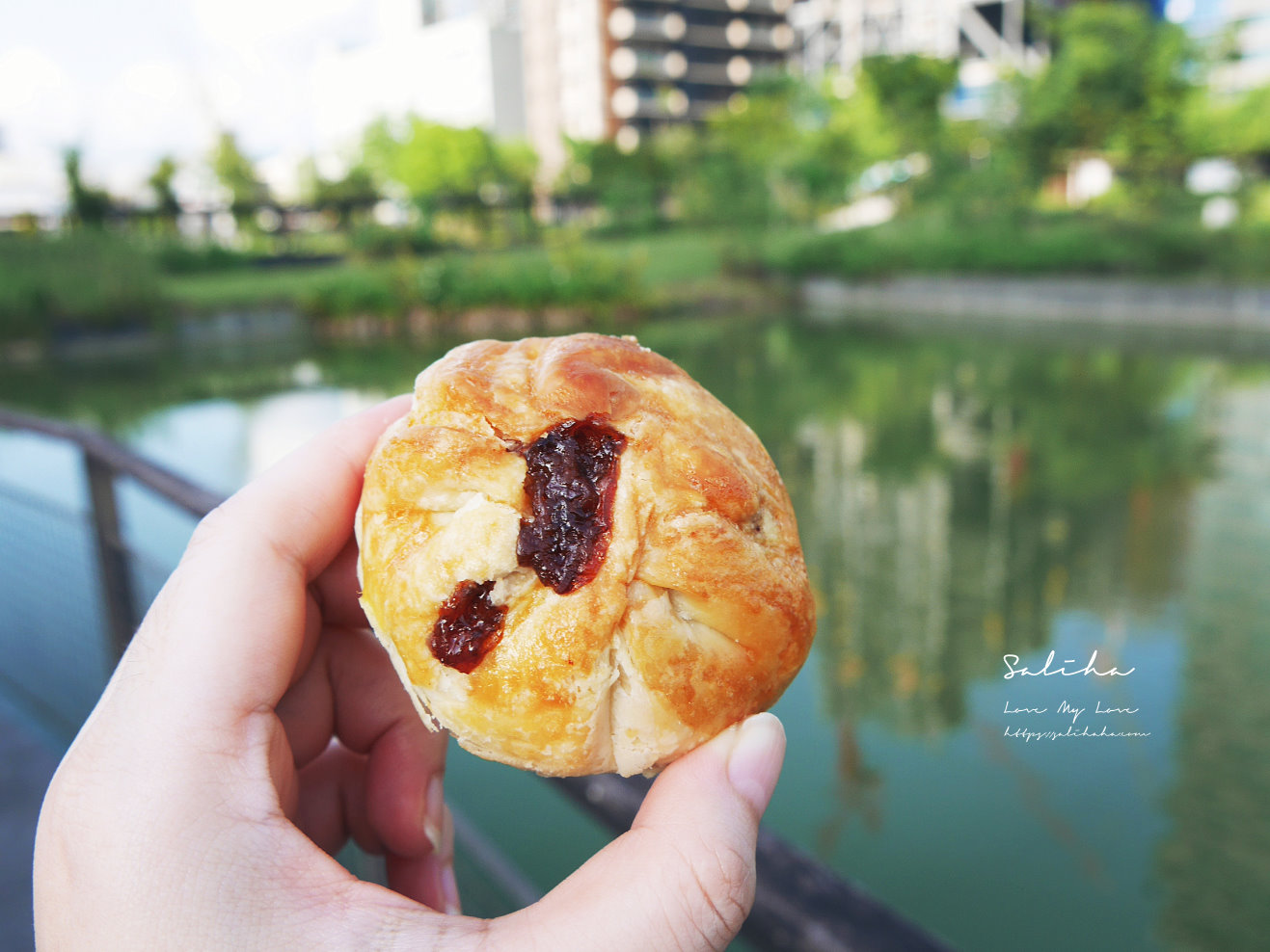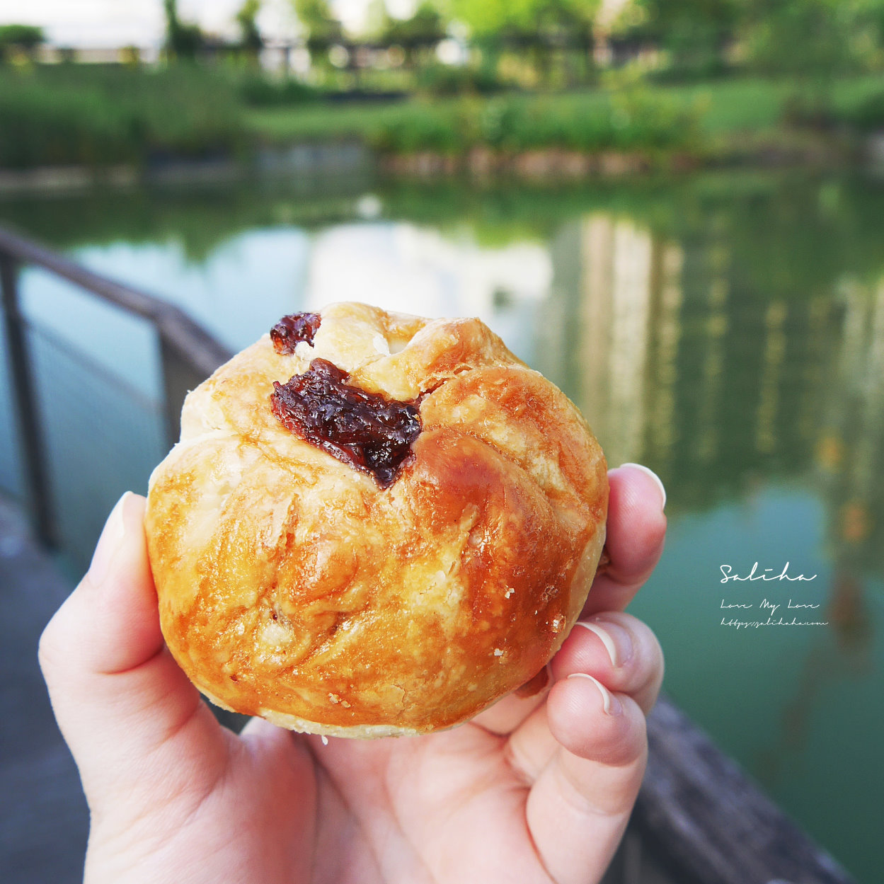 可以把燒包想成是另一種版本的叉燒酥,咬下去皮很酥香,內餡是甜大於鹹、香滑不柴的叉燒風豬肉餡,香氣瀰漫、份量紮實的肉餡配上香酥微脆又有濃香的外皮相當可口,好吃又有口感,而且冷掉吃也很讚耶,不影響美味,非常適合帶幾顆去野餐,今天買來當散步小點真是對了,恰好剛剛也買了一杯金萱茶,看看美景、吃點茶點,多麼愜意舒暢啊!